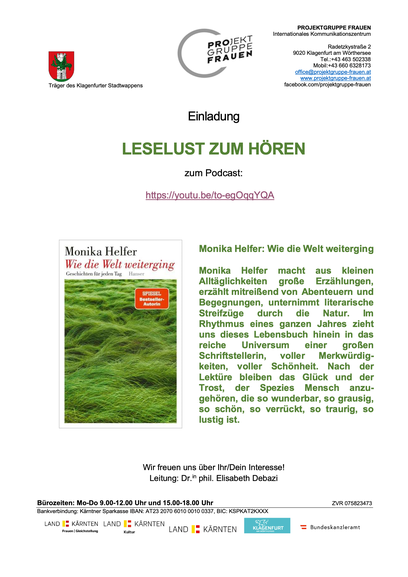 Die PROJEKTGRUPPE FRAUEN ist eine Erwachsenen-Bildungseinrichtung in Klagenfurt. Wir bieten Sprachkurse, Bildungsveranstaltungen, Vernetzung, Begegnung und Kulturaustausch für Frauen aus aller Welt sowie Beratung, Begleitung und Unterstützung für alle Lebenslagen. Wir helfen, Lösungen zu finden und stehen mit Rat und Tat zur Seite.