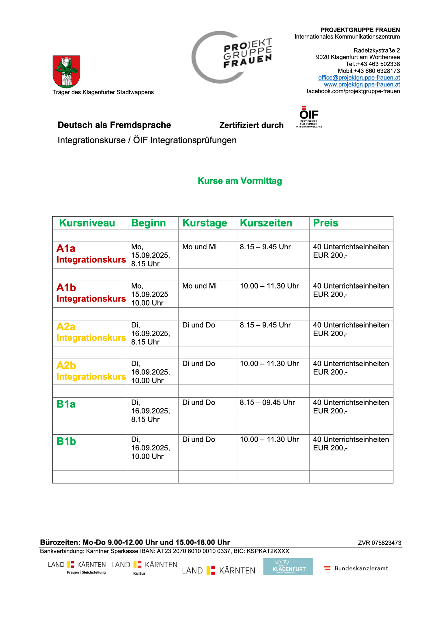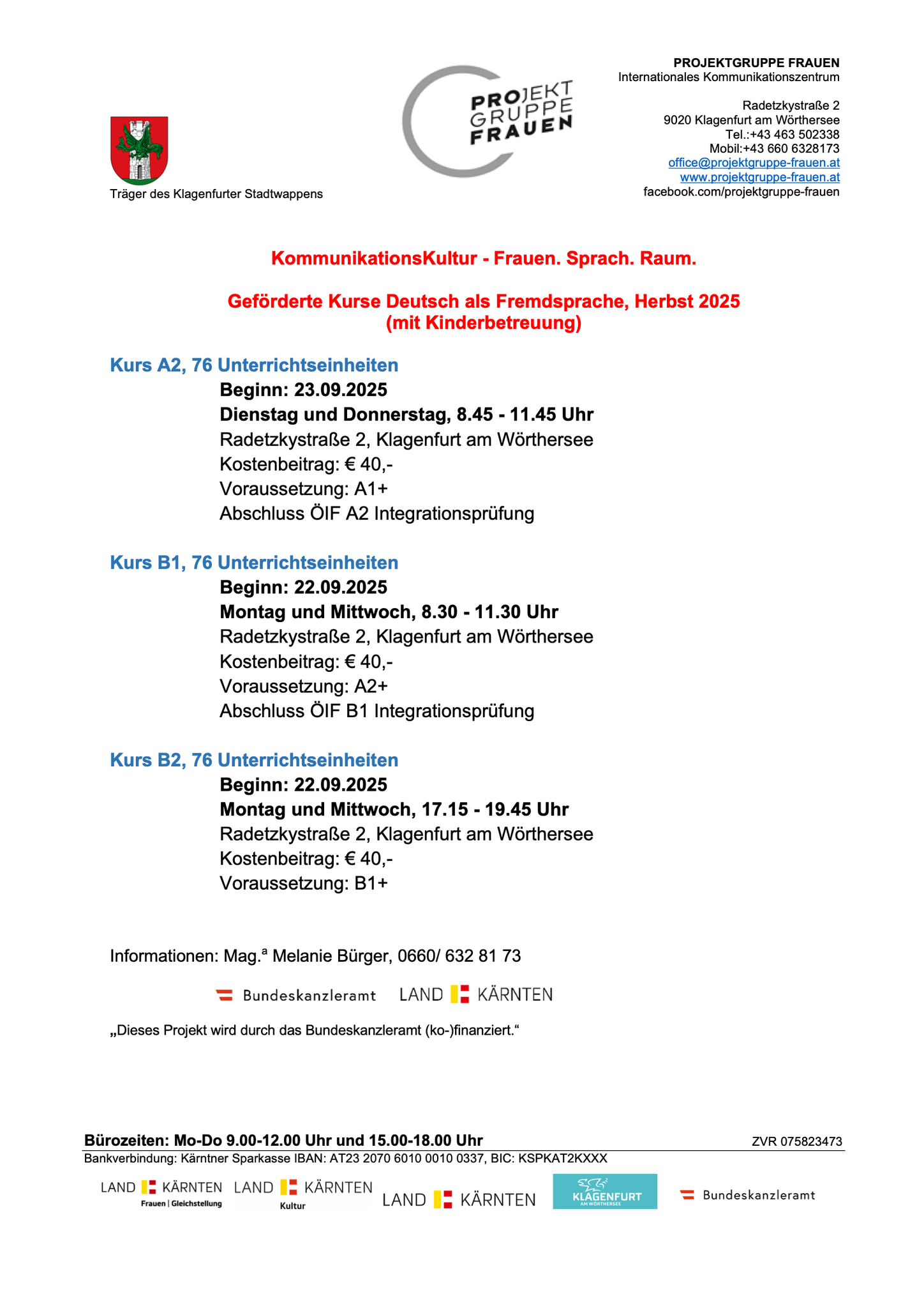 Die PROJEKTGRUPPE FRAUEN ist eine Erwachsenen-Bildungseinrichtung in Klagenfurt. Wir bieten Sprachkurse, Bildungsveranstaltungen, Vernetzung, Begegnung und Kulturaustausch für Frauen aus aller Welt sowie Beratung, Begleitung und Unterstützung für alle Lebenslagen. Wir helfen, Lösungen zu finden und stehen mit Rat und Tat zur Seite.