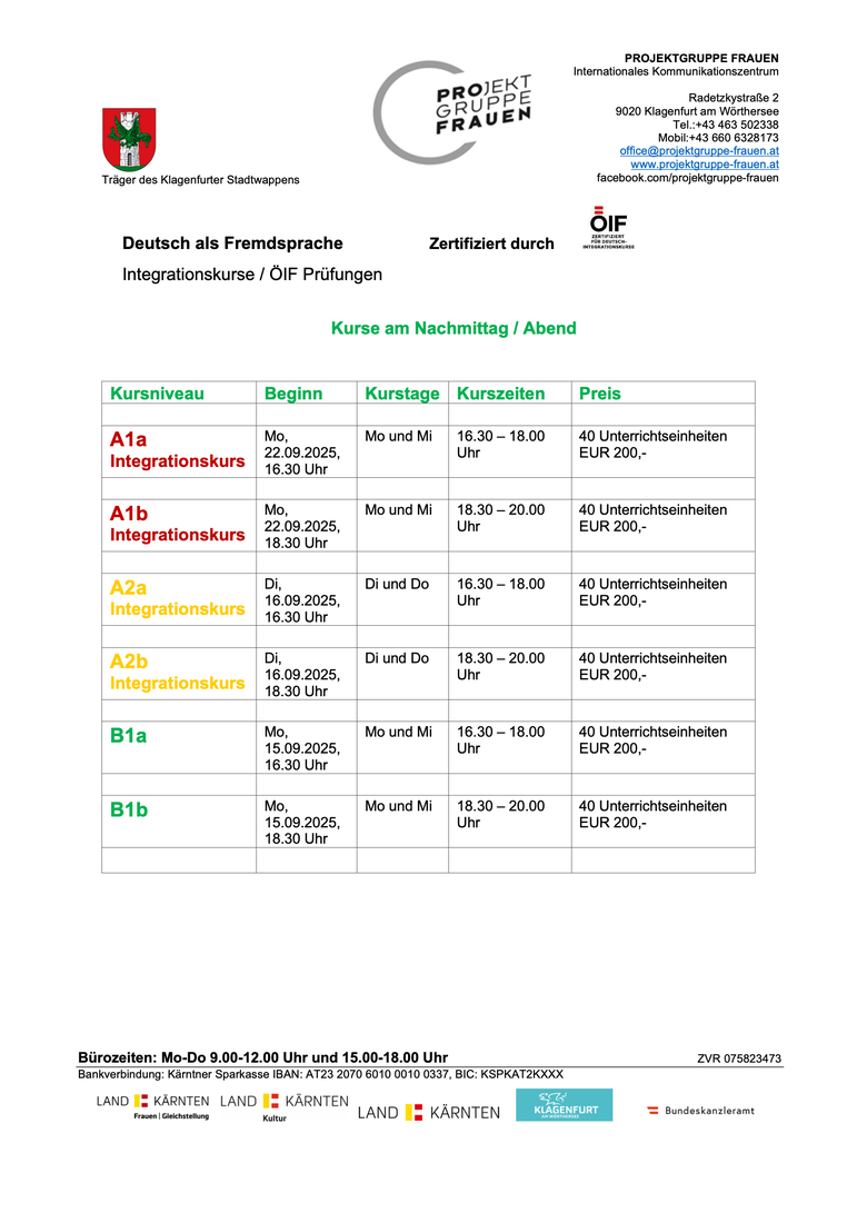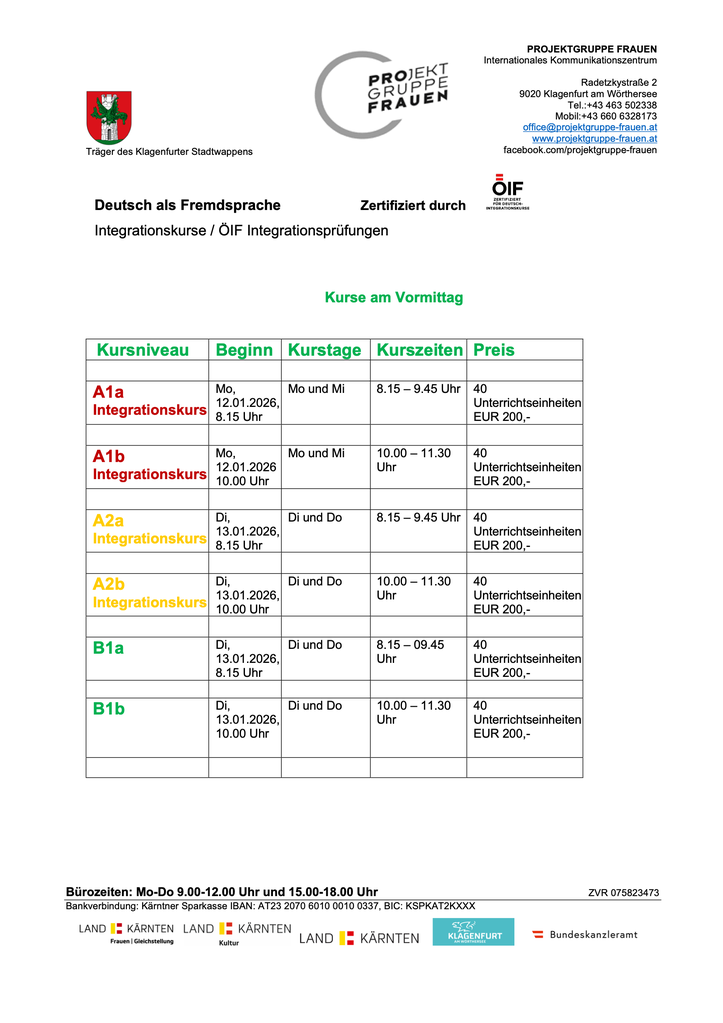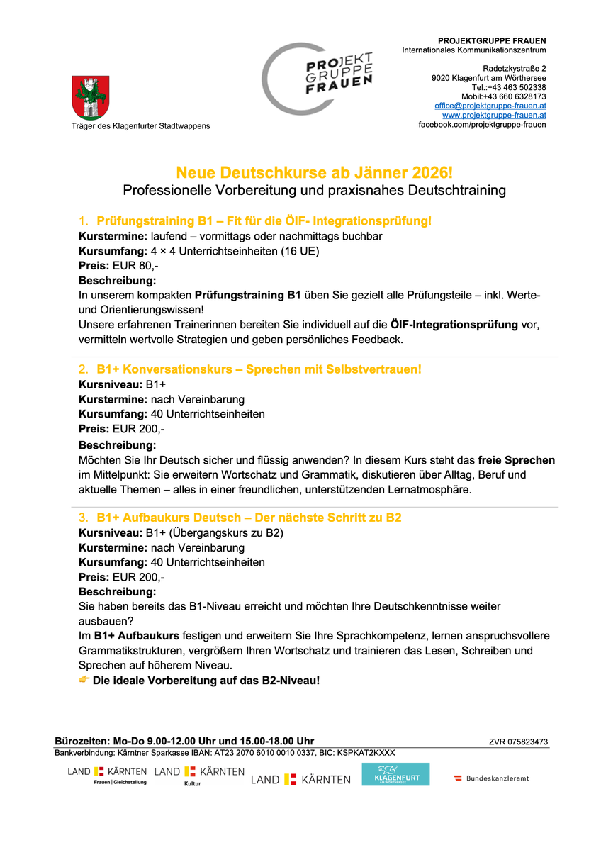 Kursort: Veranstaltungsraum der PROJEKTGRUPPE FRAUEN, Radetzkystraße 2, 9020 Klagenfurt am Wörthersee